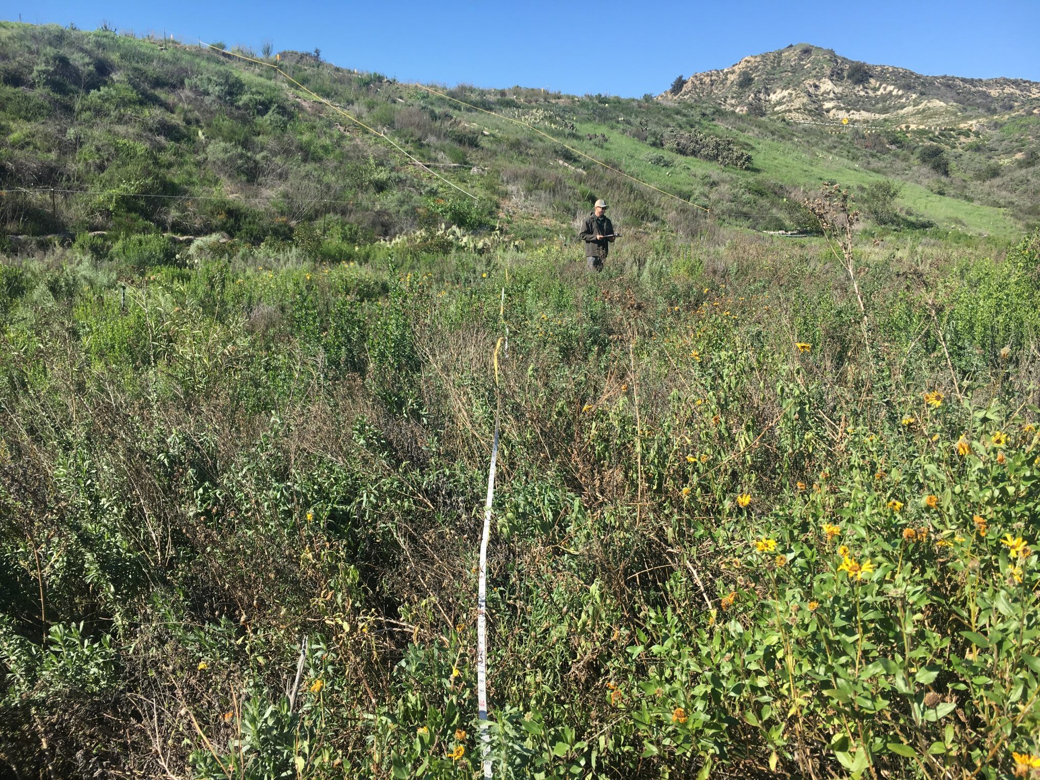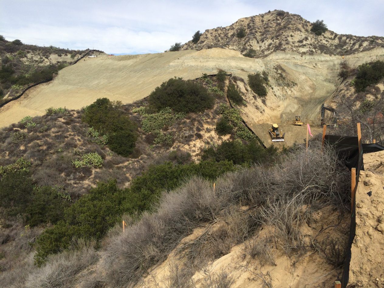 Restoration monitoring at the 19-acre revegetation site included the following tasks: nursery visits to check on the status and health of the container plants, coordination with USFWS regarding the seed mix, and monitoring the hydroseeding effort and container planting. Leatherman BioConsulting, Inc. also conducted qualitative and quantitative monitoring, which included site photographs, health assessment of the site, line intercept vegetation transects, and preparation of quarterly and annual reports, which were submitted to USFWS and CDFW.